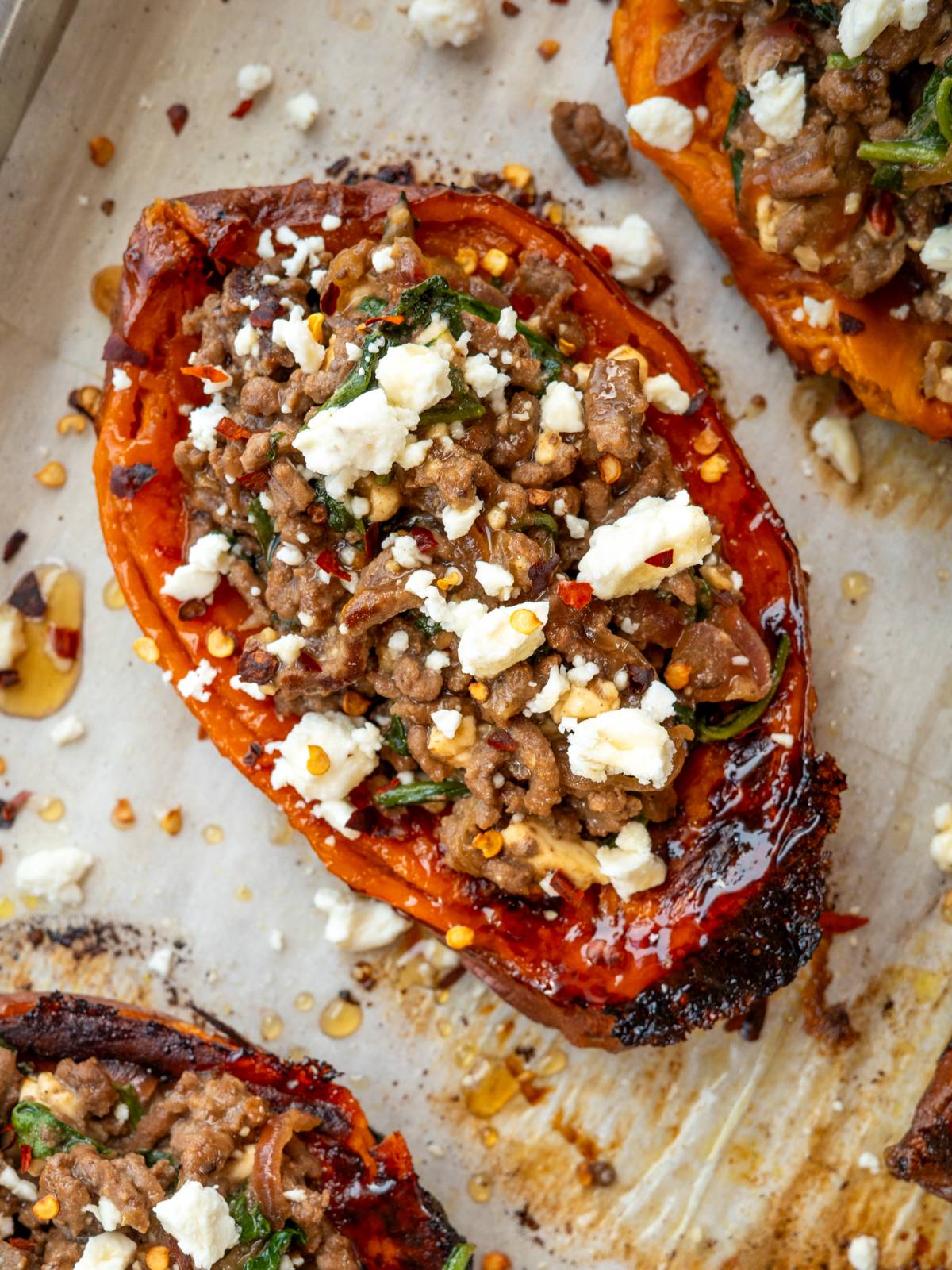 I spent a couple weeks in September hyper fixated on roasted sweet potato halves. You just slice the potatoes lengthwise, rub ‘em down with a little olive oil, and bake cut-side-down until they’re nice and caramelized. They taste like candy. So good. I made three recipes for stuffed halves with chipotle bbq ground chicken, Japanese bbq beef (with Japanese sweet potatoes), and ground beef + spinach.