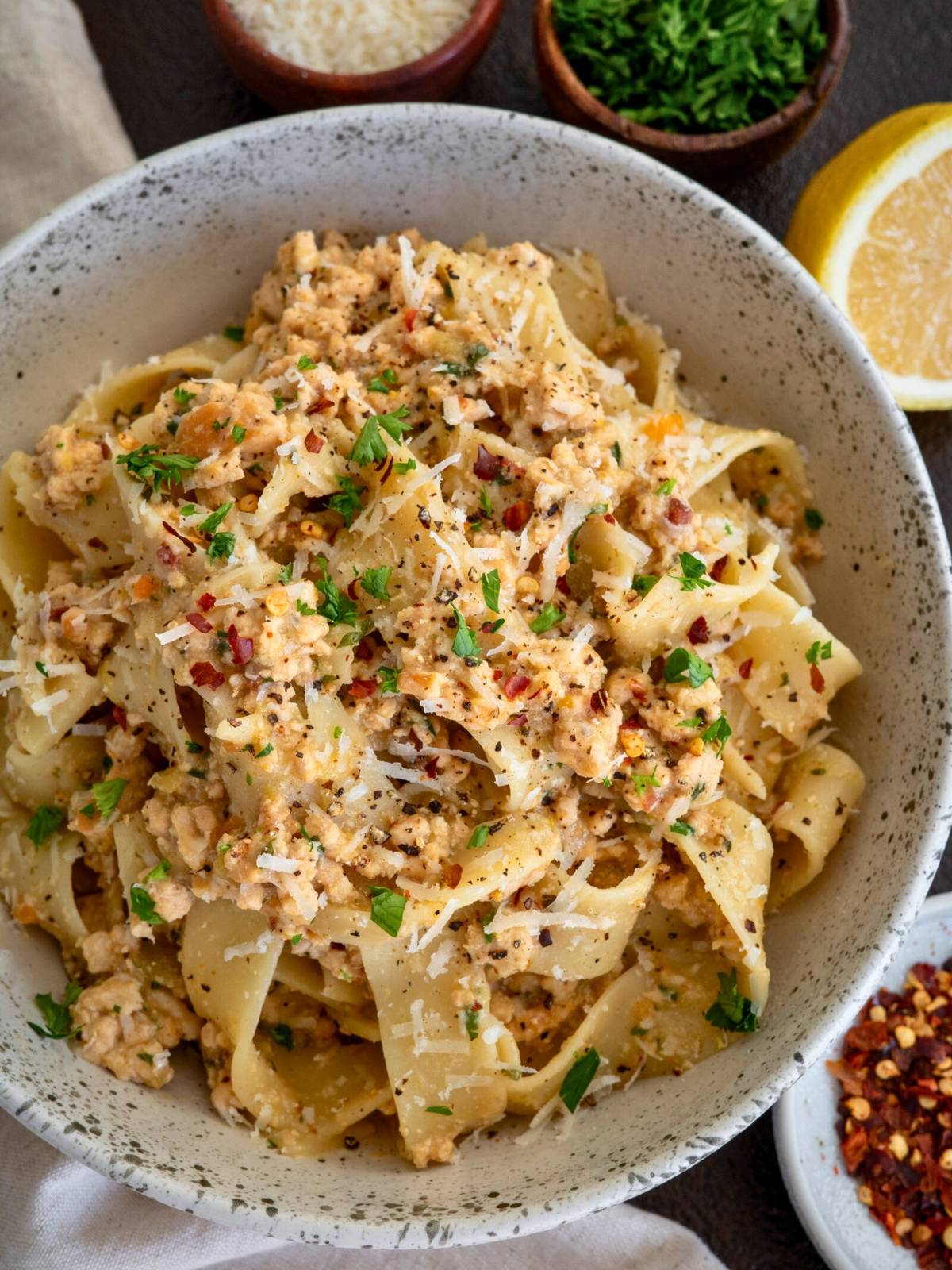Bolognese never gets much attention on my blog. I think because it’s a bit labor intensive, but maybe I just suck at marketing it? Either way, I keep making a new variation each year. This is a spin on bolognese bianco or white bolognese made without any tomatoes. Just ground chicken, mirepoix, chicken bone broth, and milk. 28g protein, 5g carbs, 6g fat, and 175 calories per serving to make great spag-bol, lasagna, sandwiches—all kinds of stuff.