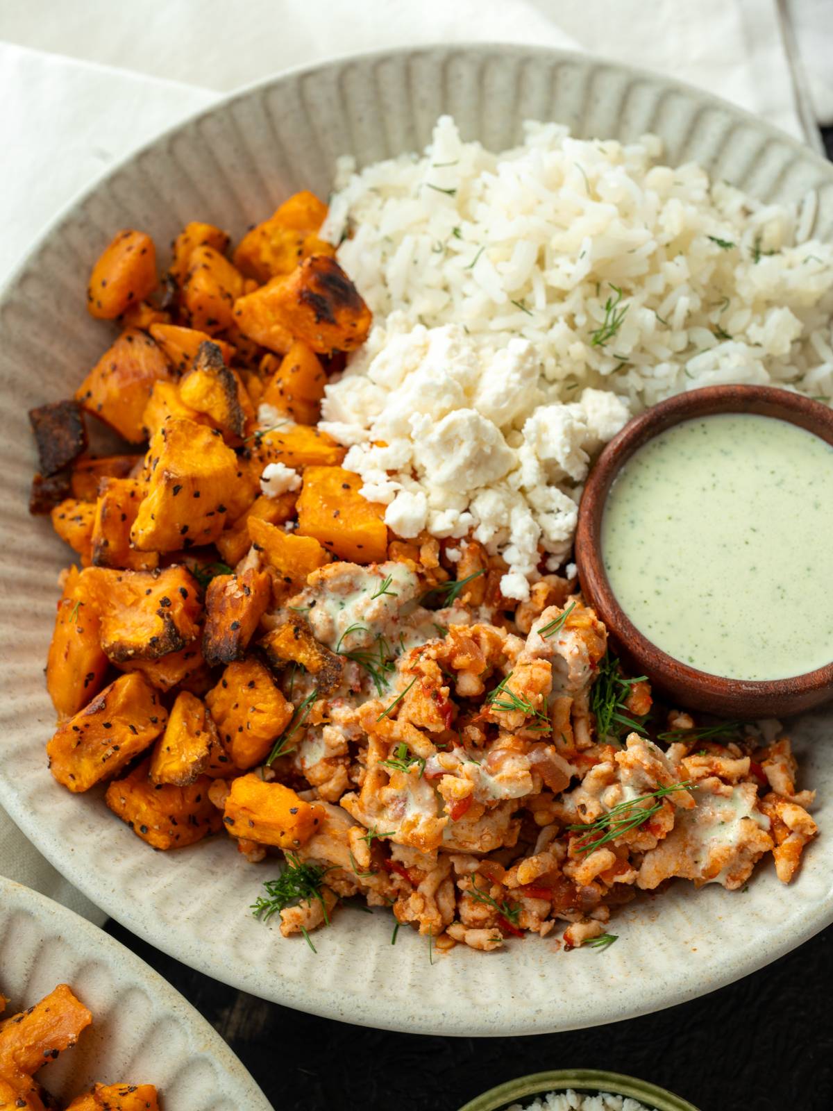 If I’m picking a favorite mince or ground protein recipe of the year, this takes the cake. The feta sauce is so good. And macros wise, each bowl has 51 grams of protein with just 9 grams of fat and 500 calories.